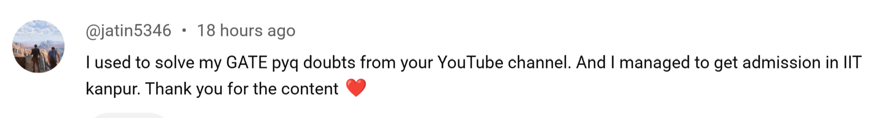 Thank you mam , you are really doing great job for students who cannot afford coaching fee . still can crack gate exam